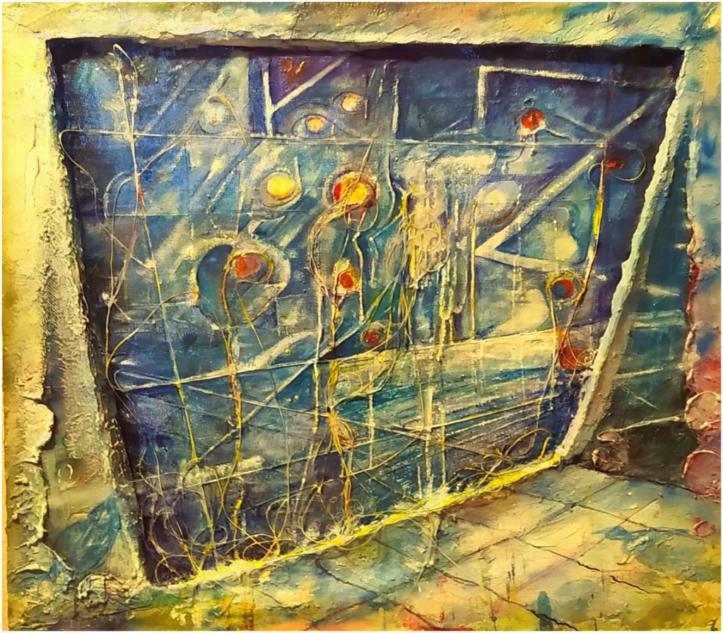 Composizione realizzata in una tela, è stata tagliata a forma di trapezio per esprimere un riquadro, una visione bellica contemporanea vista da lontano.