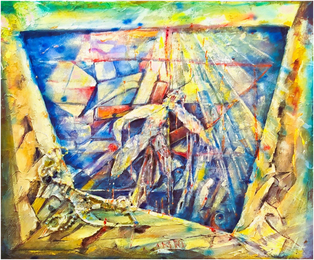 Il rosario caduto tra i due muri, la croce, una sembianza umana sono calpestati, i raggi illuminano lo spazio frantumato.