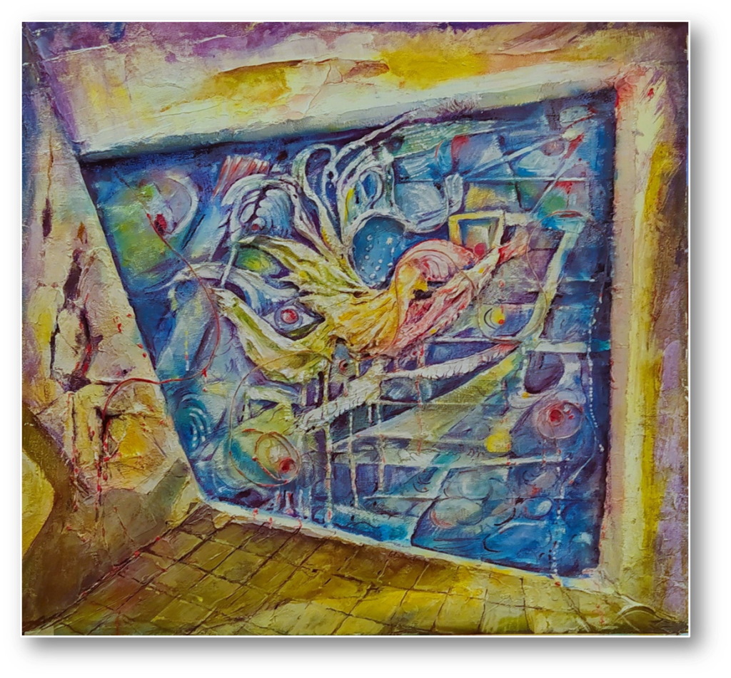 Volatile consueto con tinte e toni dei popoli pazientemente svolazza nell’azzurro, il rosso, le linee spigolose rompono il suo ondulato movimento.